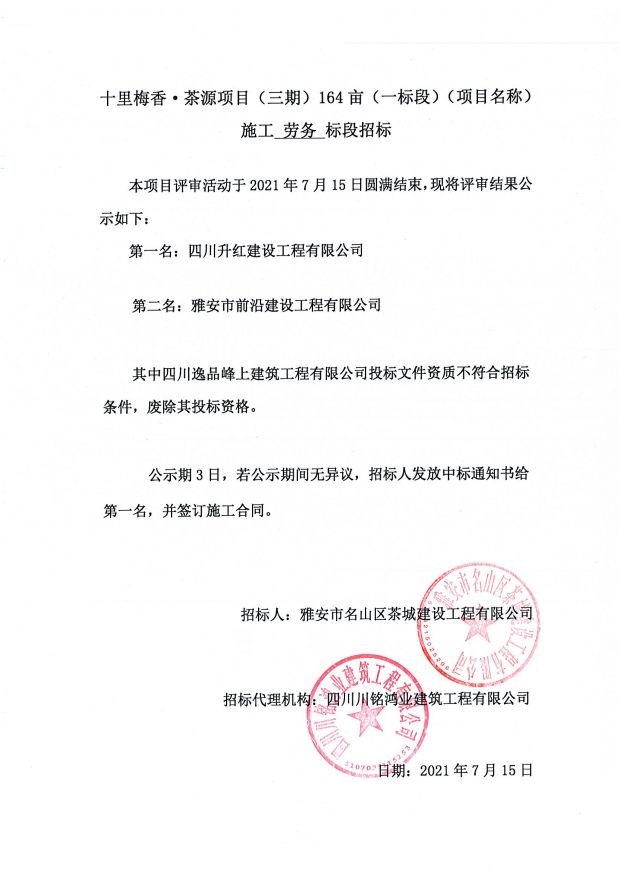十里梅香茶源項目(三期)164畝施工總承包一標段施工勞務標段評審公告